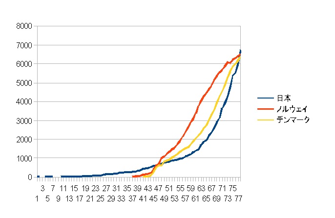 以下は現在の感染者数が日本に近い6000人台の日本(青)、ノルウェイ(赤)、デンマーク(黄)の感染者数推移を表したグラフ。